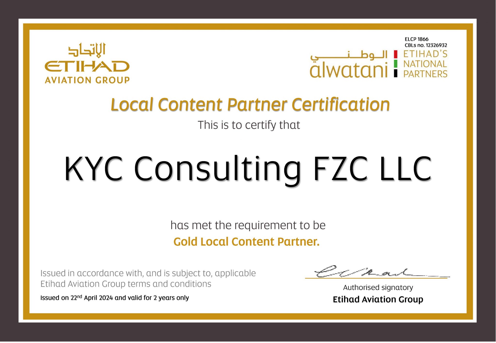 We are very proud to announce that KYC Solution ™ has obtained the Gold Local Content Partner Certification. It is honoured by the company that its efforts in developing and growing local talent, while continuing to contribute to local economies, were duly acknowledged. As certified by the Local Content Partner, we will continue to work with the businesses within the region and provide best quality services.